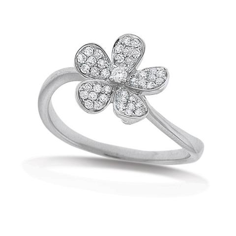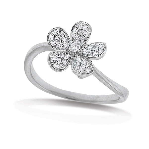 Add a tiny little touch of sweet femininity to your look with this dazzling and romantic diamond small floral ring. With 41 shimmering .20 carat total weight diamonds it has a truly irresistible sparkle and it's lovely floral shape is absolutely adorable. This lovely ring is shown here in white gold for a timeless look.