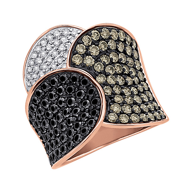 When it comes to really making a big and bold impression, the dramatic contrast between champagne, black and white diamonds will really make everyone stand up and take notice. This champagne, black and white diamond ring features a stunning array of 170 shimmering 3.25 carat total weight diamonds and is shown in rose gold with black rhodium.