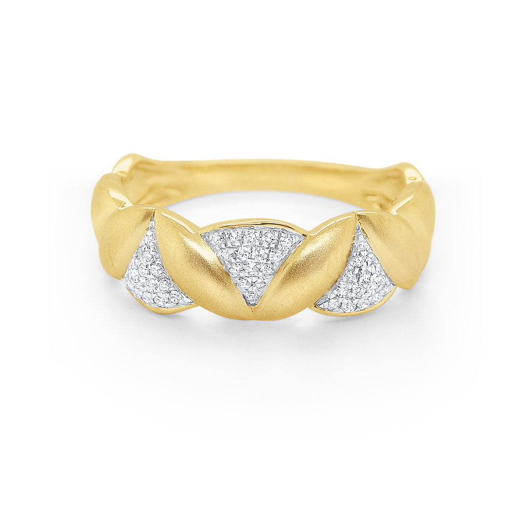 Golden leaf shapes with a soft brushed finish alternate with diamond trumpet shapes to make up this gorgeous ring.