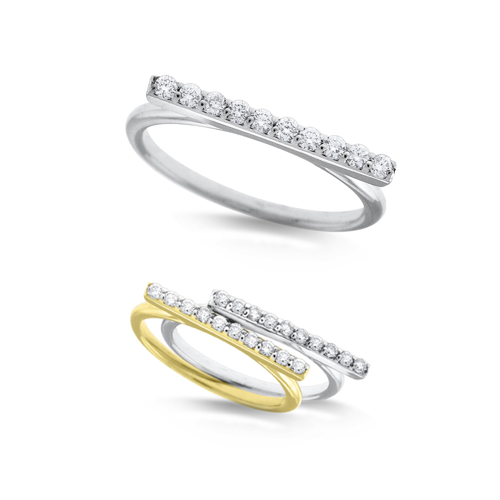 Diamond bar stack rings are a must-have fashion favorite and you will love these! Stack rings may be worn alone however any fashionista will tell you that they shine best when stacked together. Shown here, set in 14K white and yellow gold with 10 captivating diamonds weighing .16 ct tw.