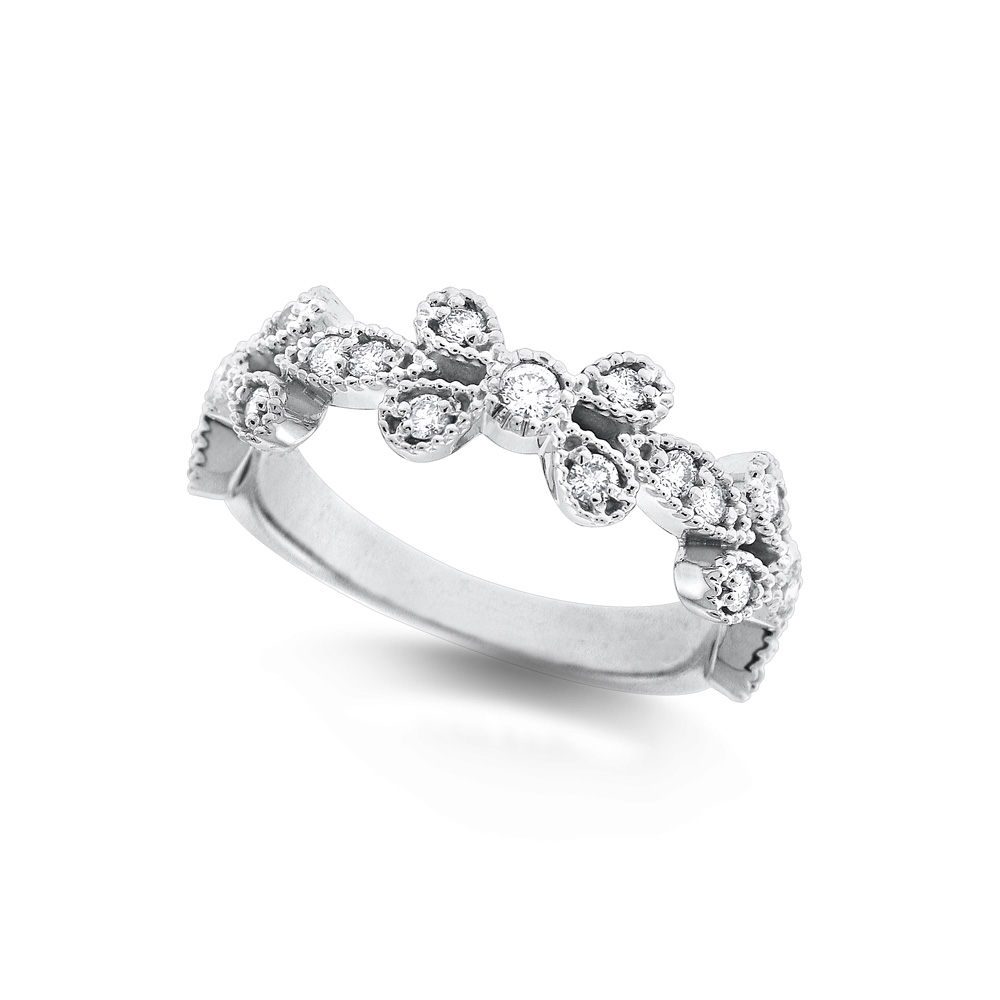 Whether you enjoy your bands stacked high, worn solo or somewhere in between - once you slip on this delightful diamond floral stack ring you will not want to take it off. Shown here set in 14K white gold with 19 diamonds weighing .34 ct tw. you will fall in love with this ring the second you slip it on.