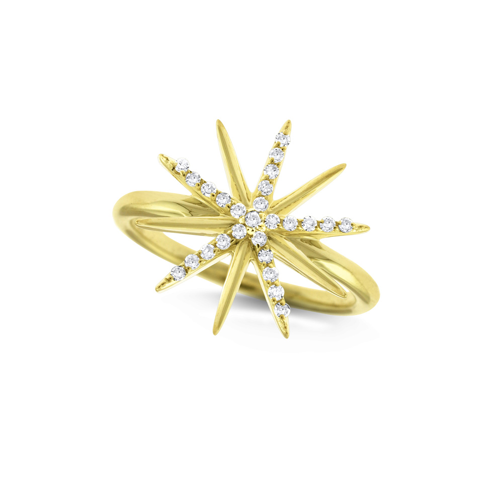This spectacularly celestial starburst shaped bauble set in 14K yellow gold with 26 sensational diamonds weighing .76 ct tw. is sure to shine in any setting. Burst onto any scene whenever you wear this cute and spiky gold and diamond ring and know that you will feel out of this universe.