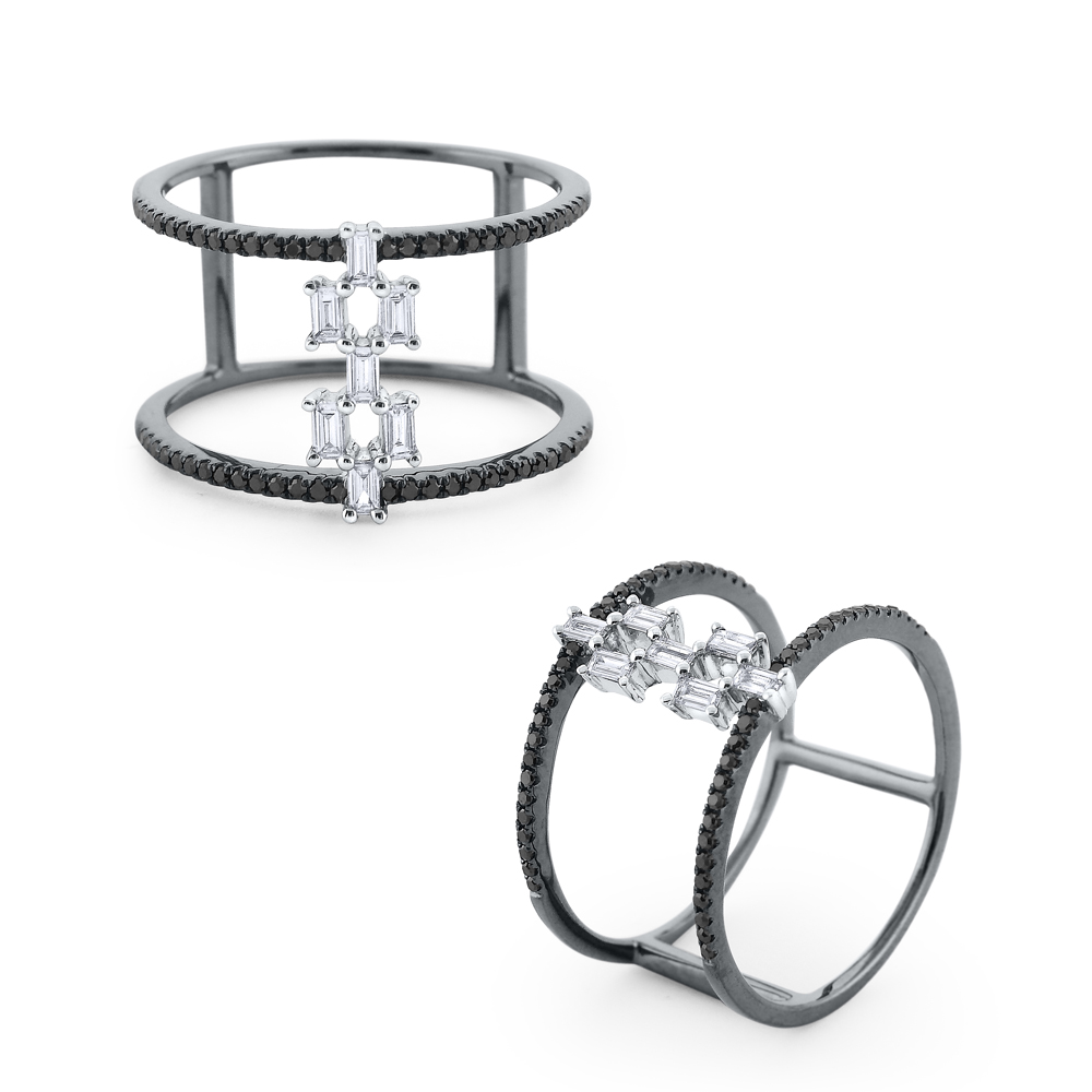 Add a hint of cool style to your look with this unique ring. Part of KC Designs Mosaic collection, this ring features two bands of glittering round brilliant black diamonds that intersect with shining baguette cut white diamonds.