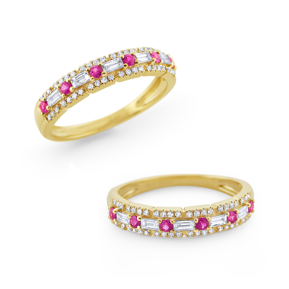 Step into Spring with this colorful band! Part of KC Designs Everyday Color dazzling pink sapphires are accented by shining round brilliant & baguette cut diamonds to create a warm, flirty look.