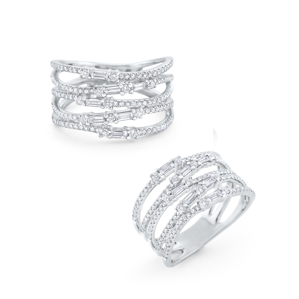 Part of KC Designs Mosaic Collection, 5 curved rows of scintillating round brilliant & baguette diamonds wrap elegantly around your finger. This airy, open-worked design is the chic, yet playful accessory you’ve been looking for.
