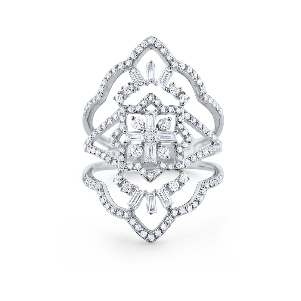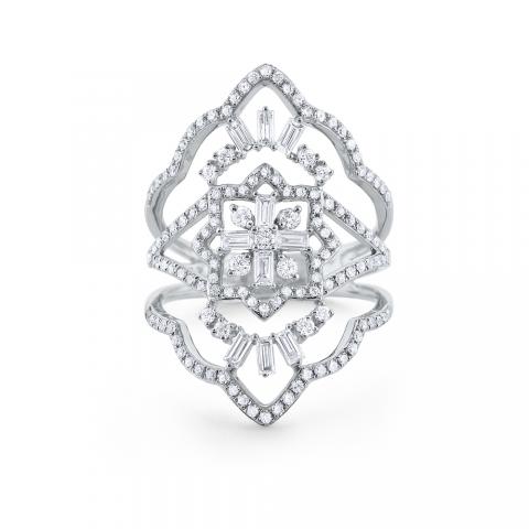 Light up your look with this decadent diamond ring. Inspired by ancient mosaics, round brilliant & baguette cut diamonds grace this ornate ring, which is part of KC Designs Mosaic Collection.