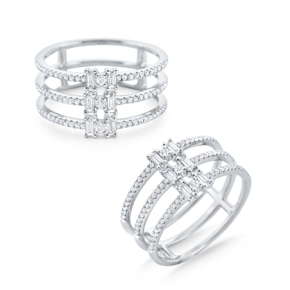 Add some geometric glam to your look with this stunning band. Part of KC Designs Mosaic collection, three rows of round brilliant diamonds intersect with sparkling baguette cut diamonds for edgy, flawless style.