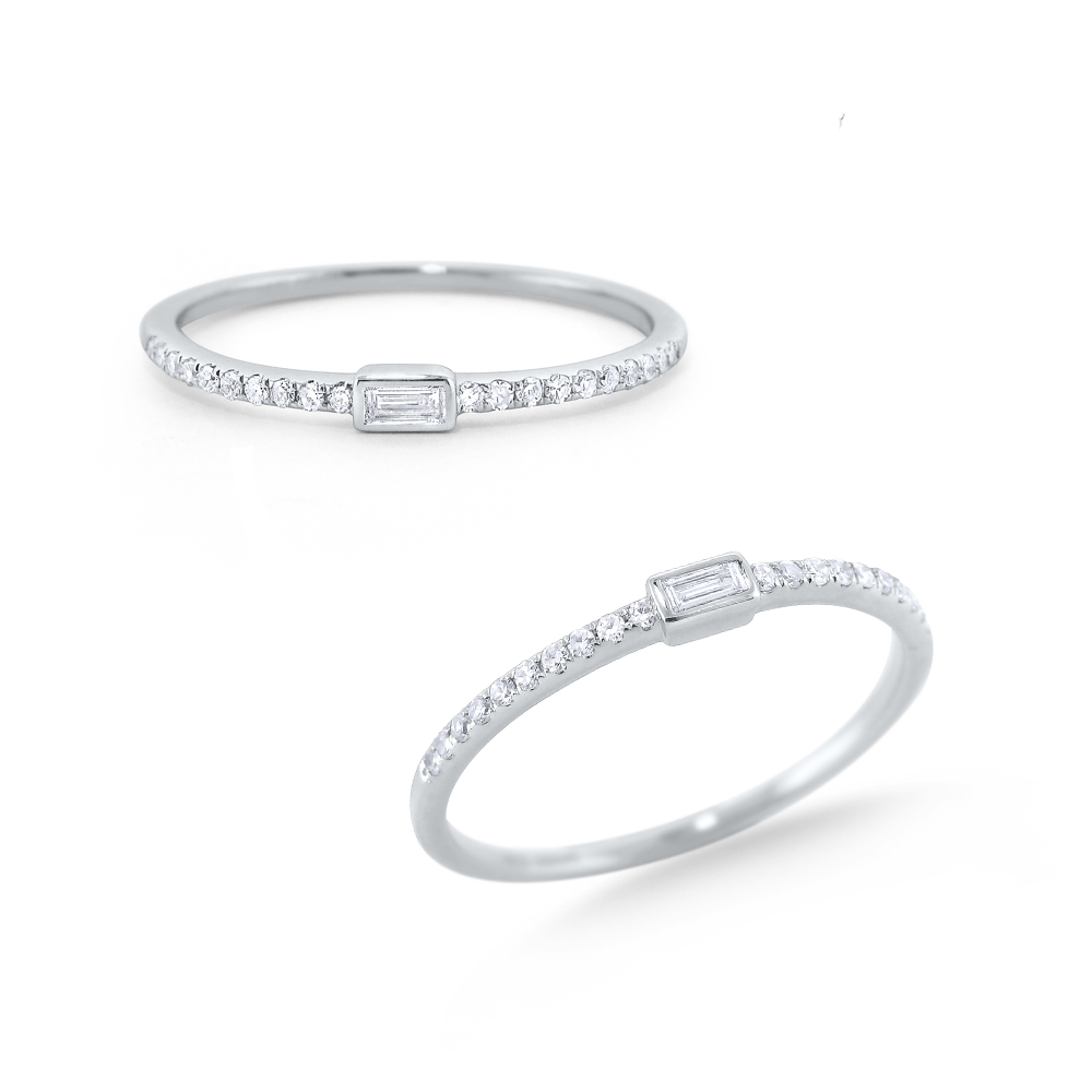 Part of KC Designs Mosaic Collection, round brilliant diamonds line up on either side of one solitaire elegant baguette cut diamond. Wear this ring solo for a dainty, understated look, or stack it with your other KC Designs Mosaic favorites!