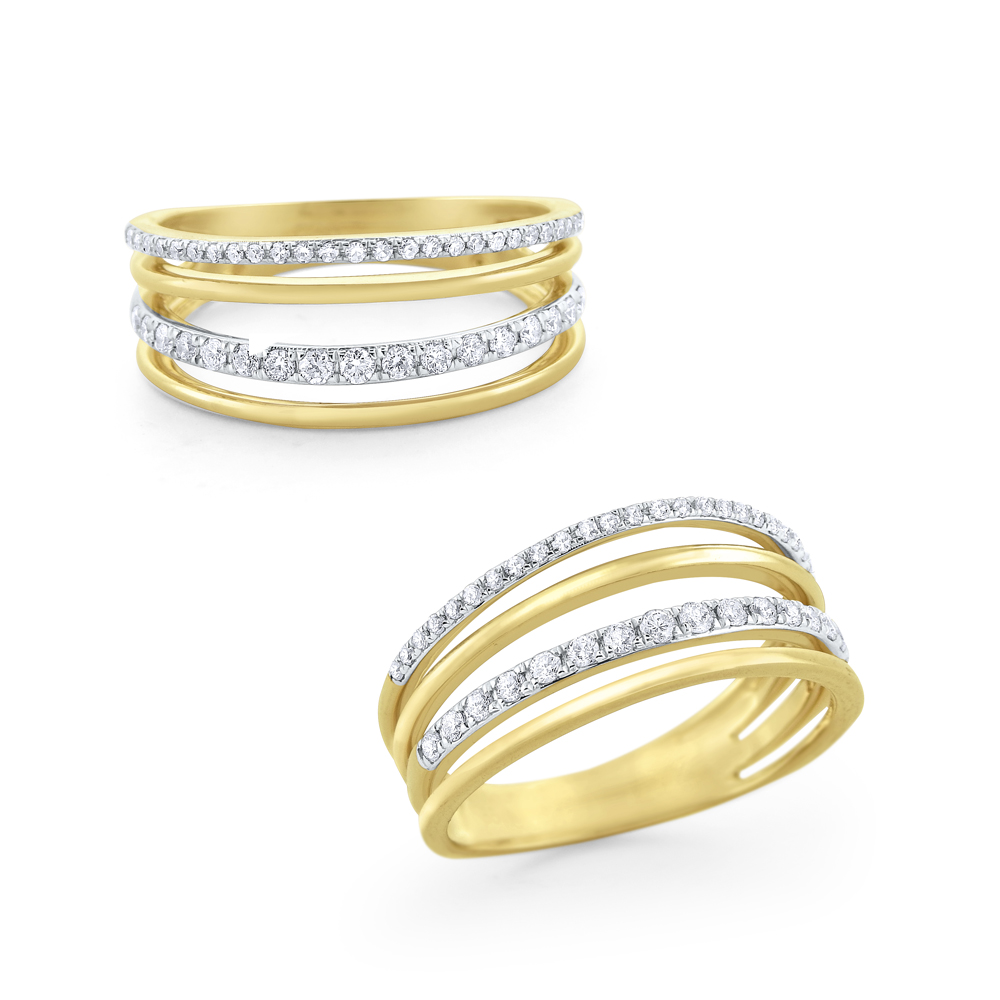 Dare to dazzle with this fun, trendy ring! Shining bands of gold are offset by rows of sparkling round brilliant diamonds. This is the everyday ring you’ve been looking for!