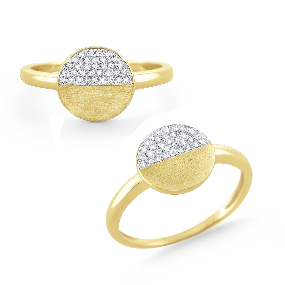Light up your look with this fun & chic ring! Brilliant pave diamonds accent half of the circular disc, & soft brushed gold is on the other half to create a trendy & tasteful effect.