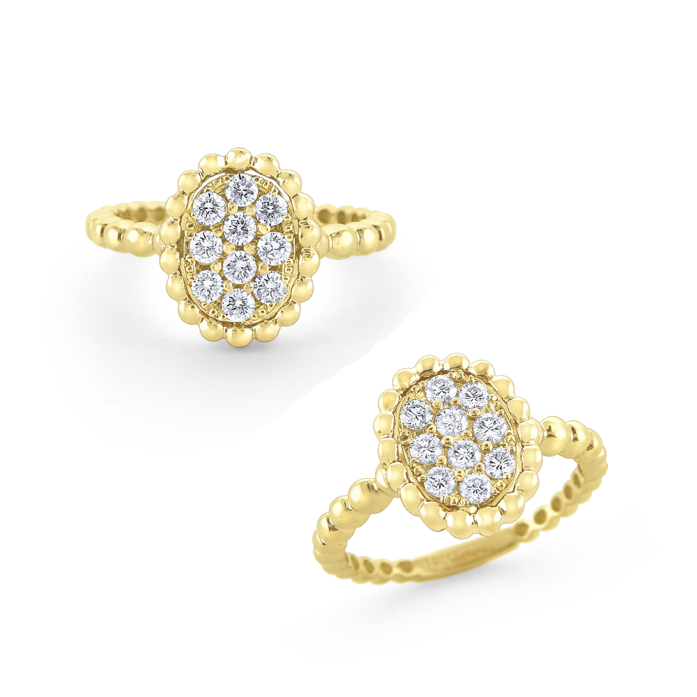 Show off your funky modern style with this chic ring. 10 dazzling diamonds are set in an oval shape and are framed by a shining gold orb pattern that is sure to light up the room.