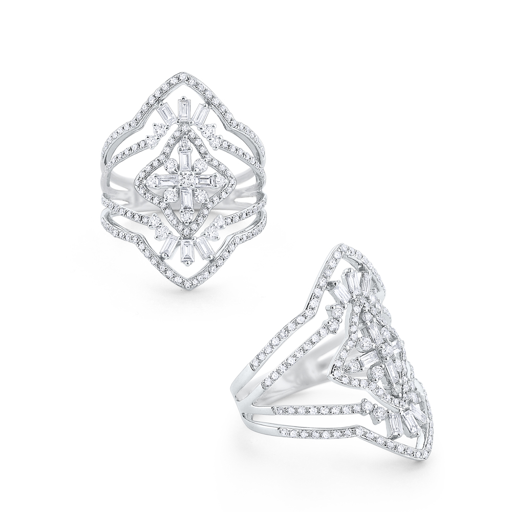 Dress to impress with this statement piece! Nothing shows off your chic appeal like this impressive and sophisticated ring! Part of KC Designs Mosaic Collection, this design pairs sparkling round brilliant diamonds with baguette cut diamonds for an airy look that evokes visions of ancient mosaics.