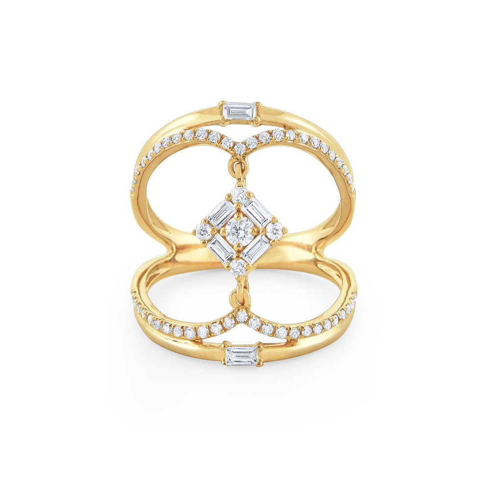 Part of KC Designs Mosaic Collection, this impressive and elegant ring is sure to put you in the spotlight. Sparkling round brilliant diamonds are paired with baguette cut diamonds in an open-worked design that evokes an airy and sophisticated vibe.