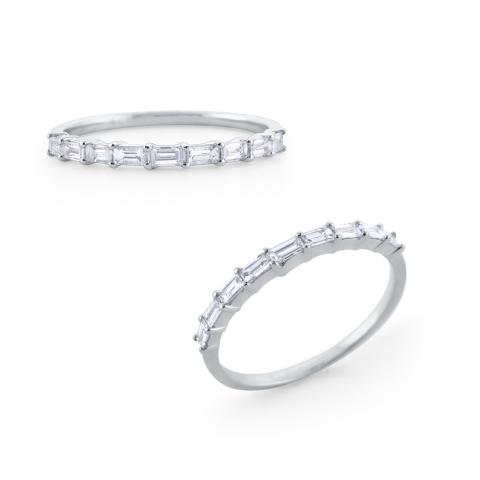 Strive for understated elegance with this shining band. Baguette cut diamonds are lined up to create a classy band that can be paired with any other stack ring.
