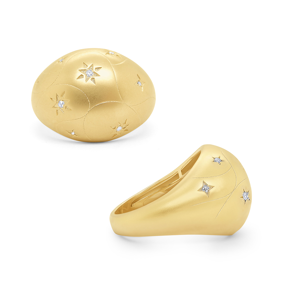 Big bold looks are all the trend - this golden dome ring with star set diamonds is the perfect addition to your fine jewelry colleciotn