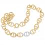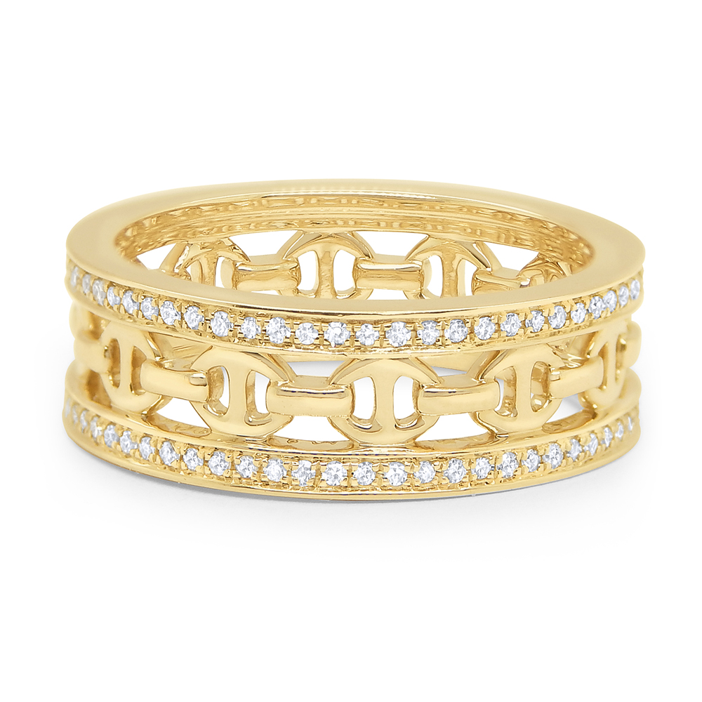 A bold mariner link design wraps around the finger between two diamond bands.