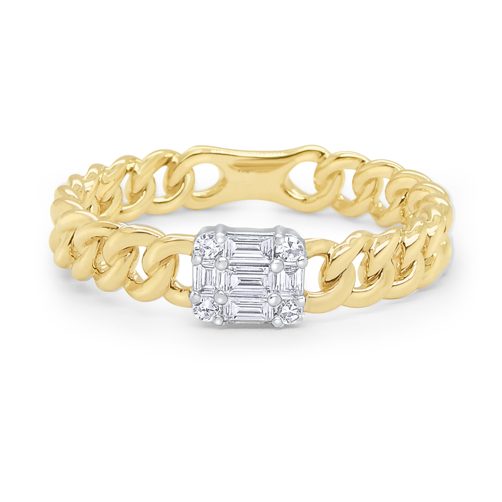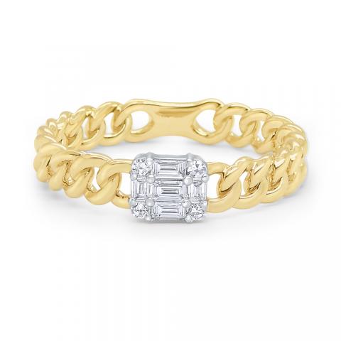 Round and baguette diamonds are set within a golden link band that comfortably wraps around the finger.