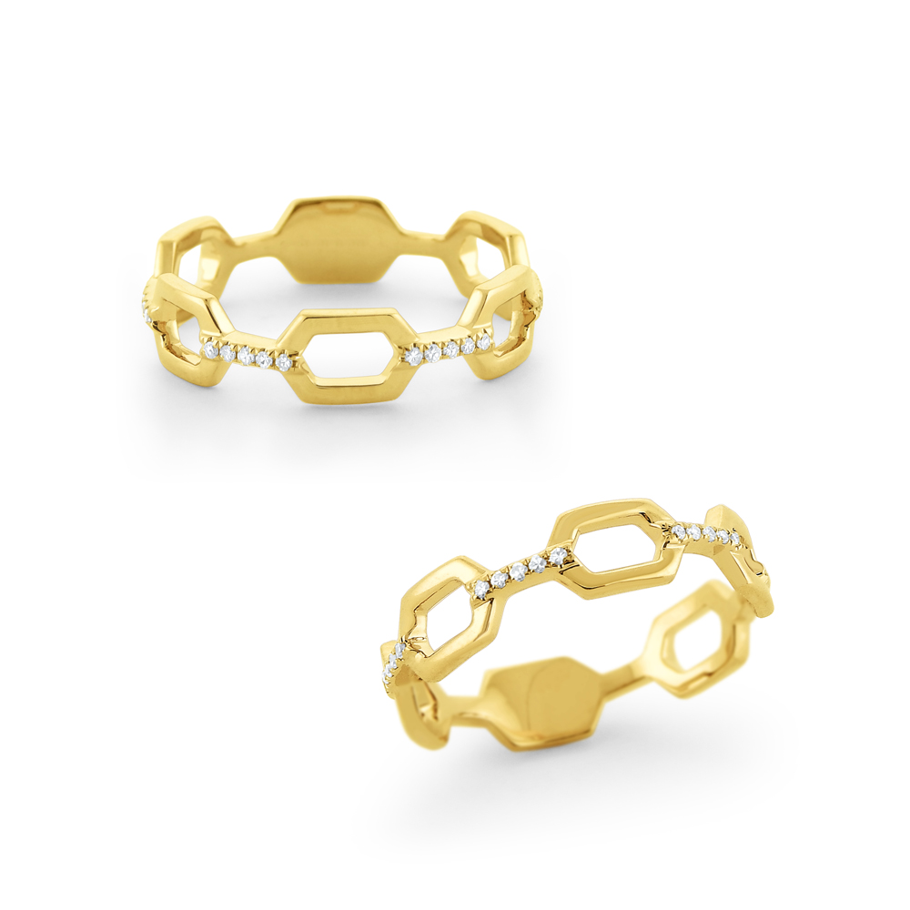 Shining Gold hexagons are connected by glimmering lines of round diamonds to create a chic, geometric look. Make it a set with any items from KC Designs Honeycomb Collection.