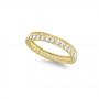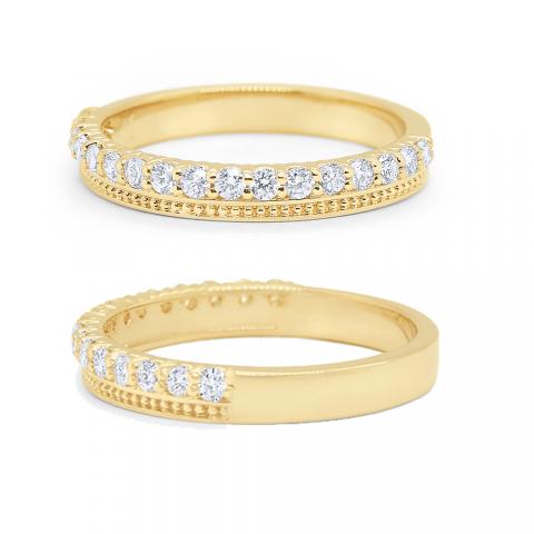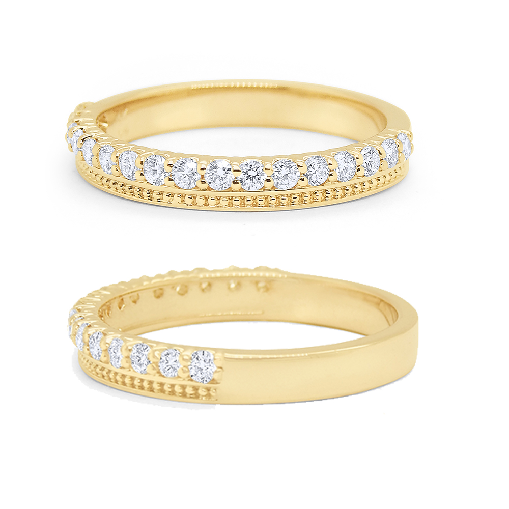 A row of diamonds bordered on one side with a beaded design makes up this simple yet stylish stack ring.