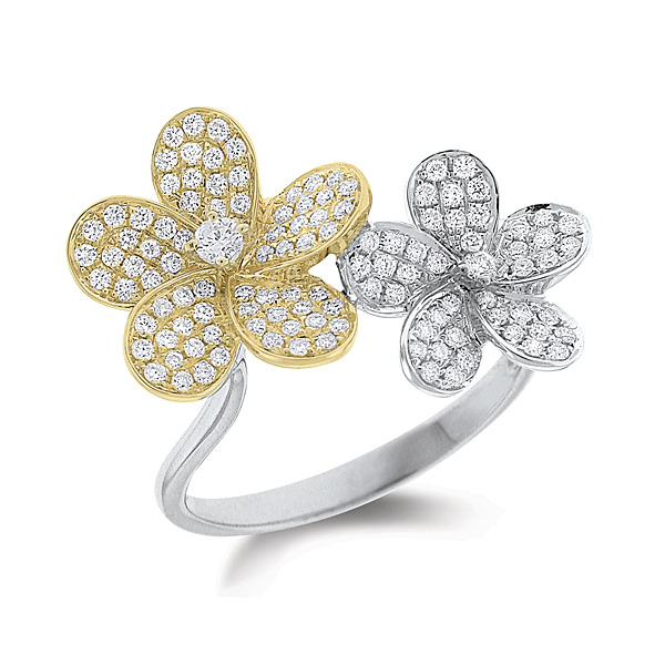 Why dazzle with one beautiful diamond decorated flower when you can have two? This sweet and feminine diamond double floral ring blooms with the radiant light of two flowers so that you can make a flirtatious and girly nature-inspired fashion statement. It features 122 brilliant .52 ct tw diamonds and it is shown here in white and yellow gold.