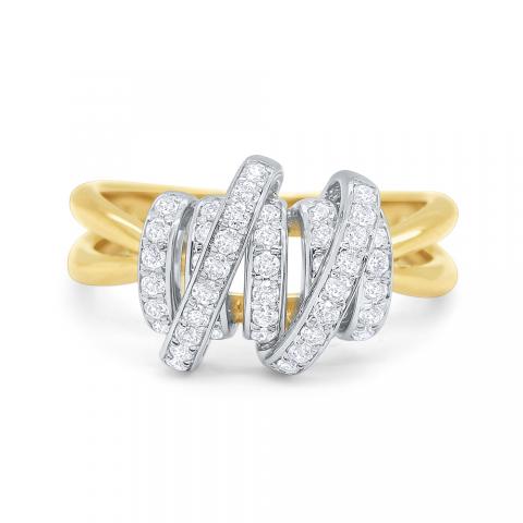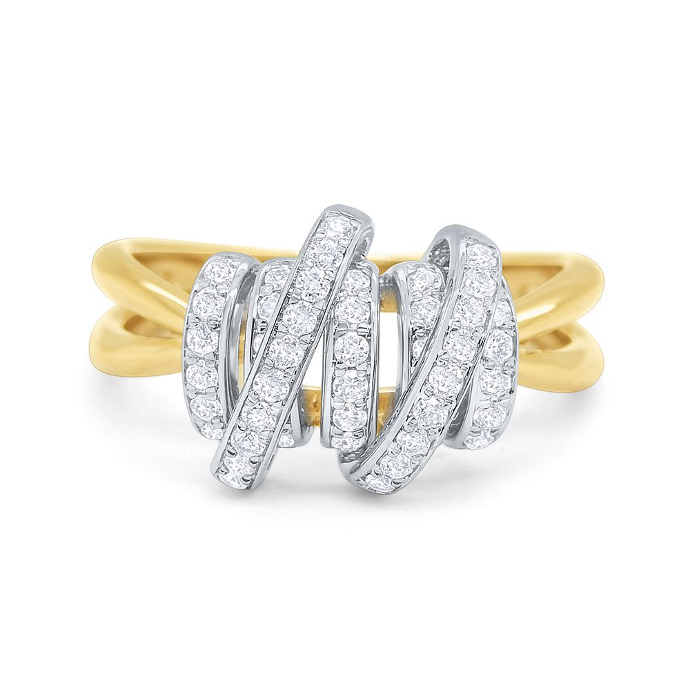 A sparkling diamond ribbon wraps around two 14k golden bands. A fabulous right hand ring to add to your collection.