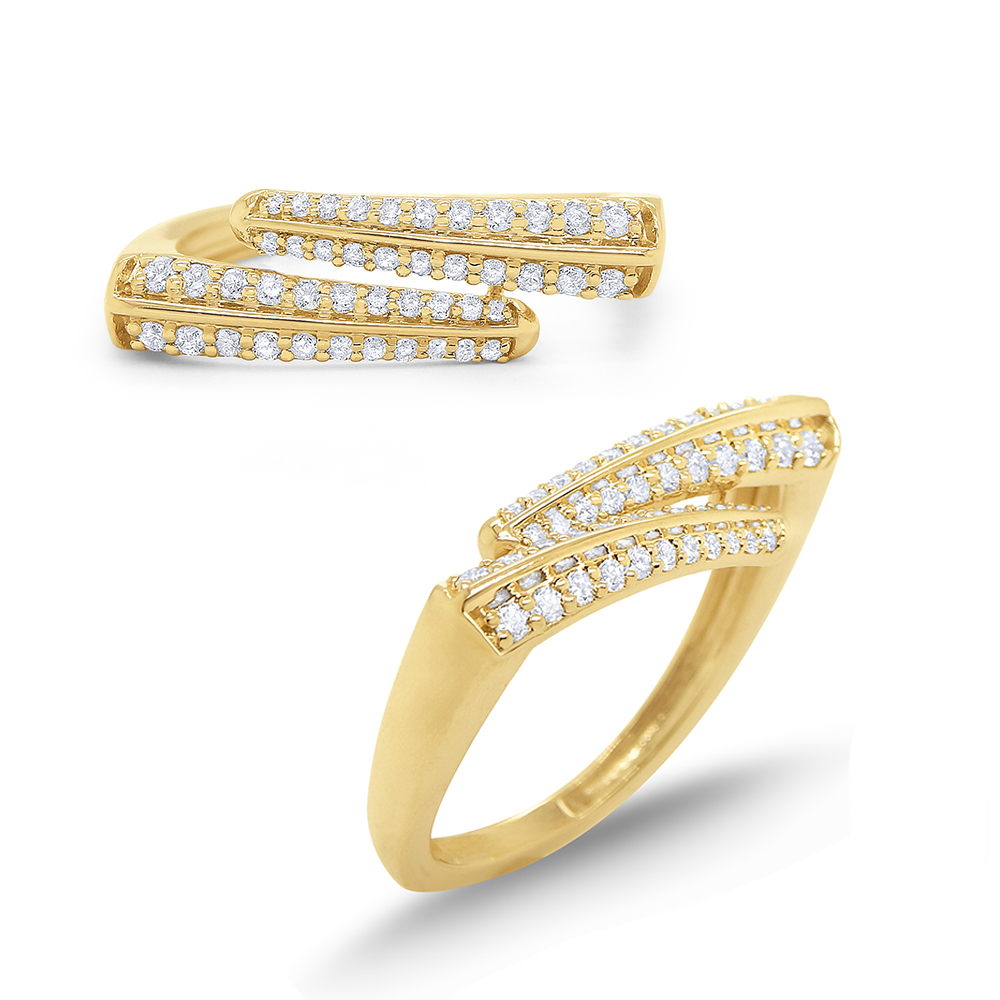 Rows of pave set diamonds are separated by a golden blade forming this chic modern ring.