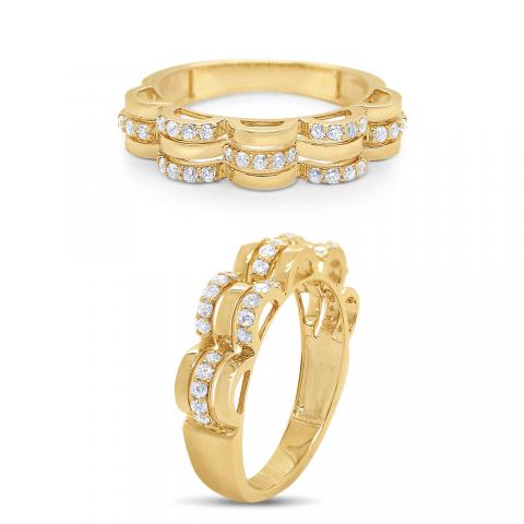 Half dome shapes of gold and diamonds create a checked pattern that cascades over and around the finger.