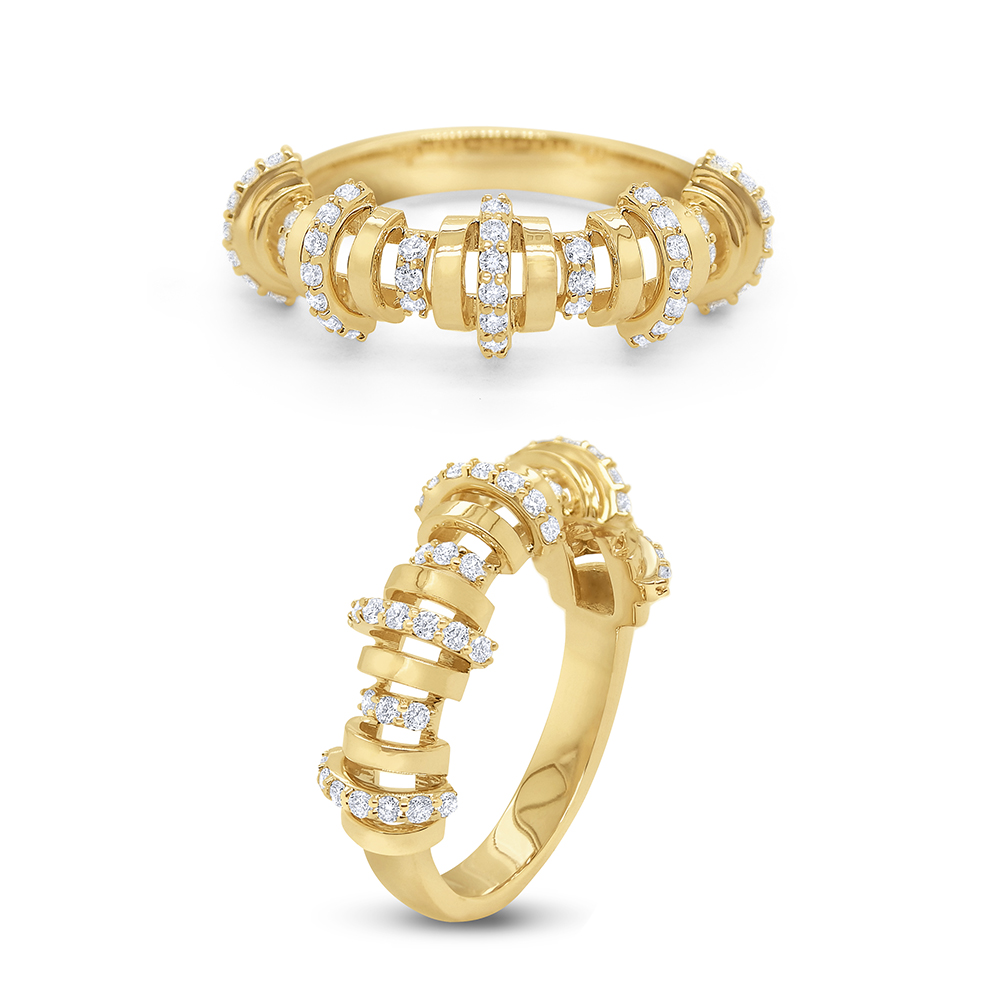 Curved segments of gold and diamonds 'cascade' over and around the finger....very mod.
