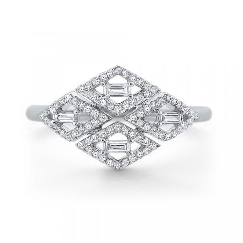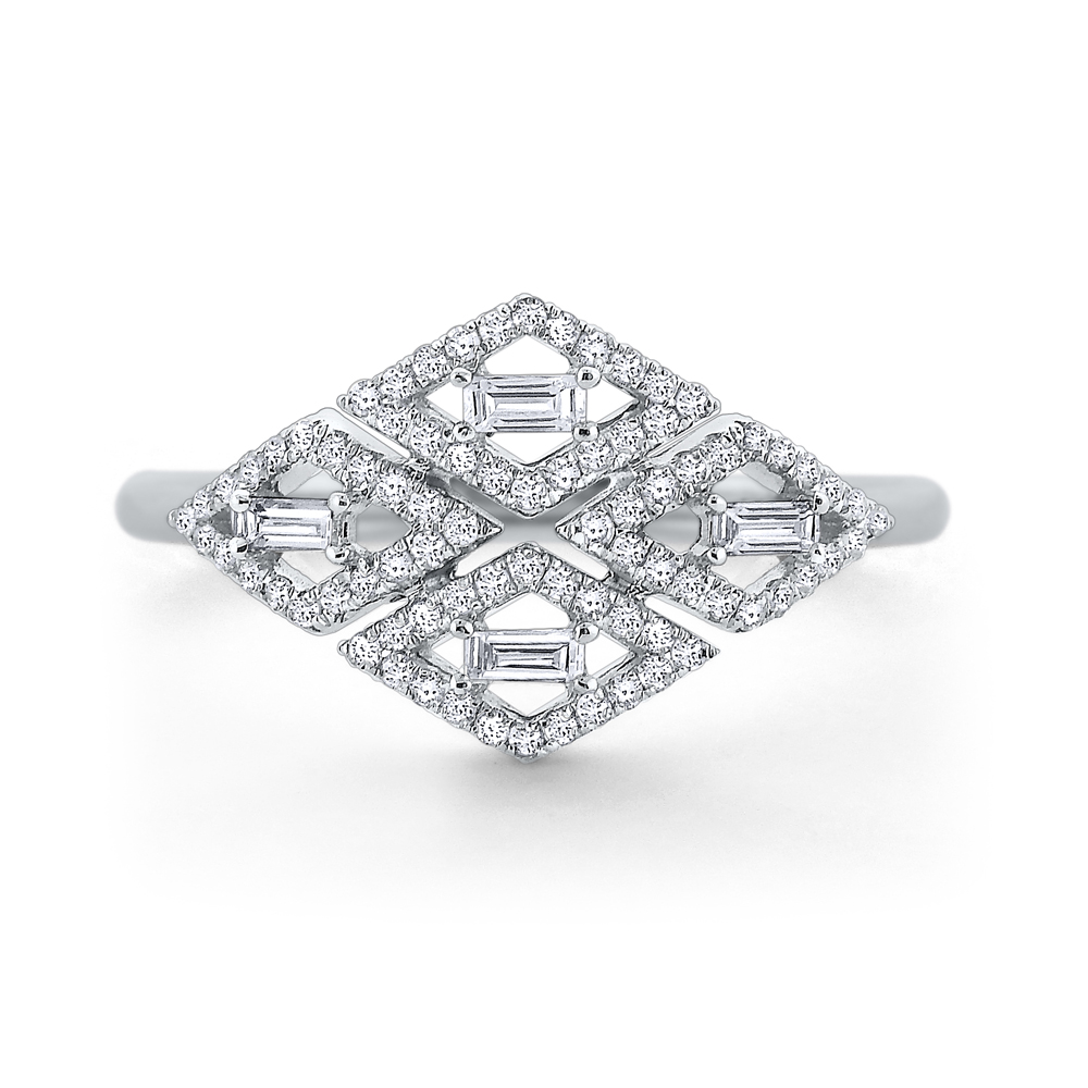 Fly high in this stylish ring! Part of KC Designs Mosaic Collection, sparkling baguette diamonds play with glittering round diamonds in four kite shaped quadrants.