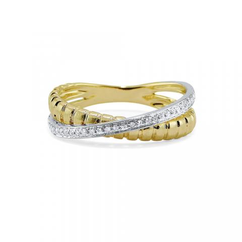 Diamonds sparkle in gold as they cross over a textured band with a matte finish for contrast and a fresh modern look.