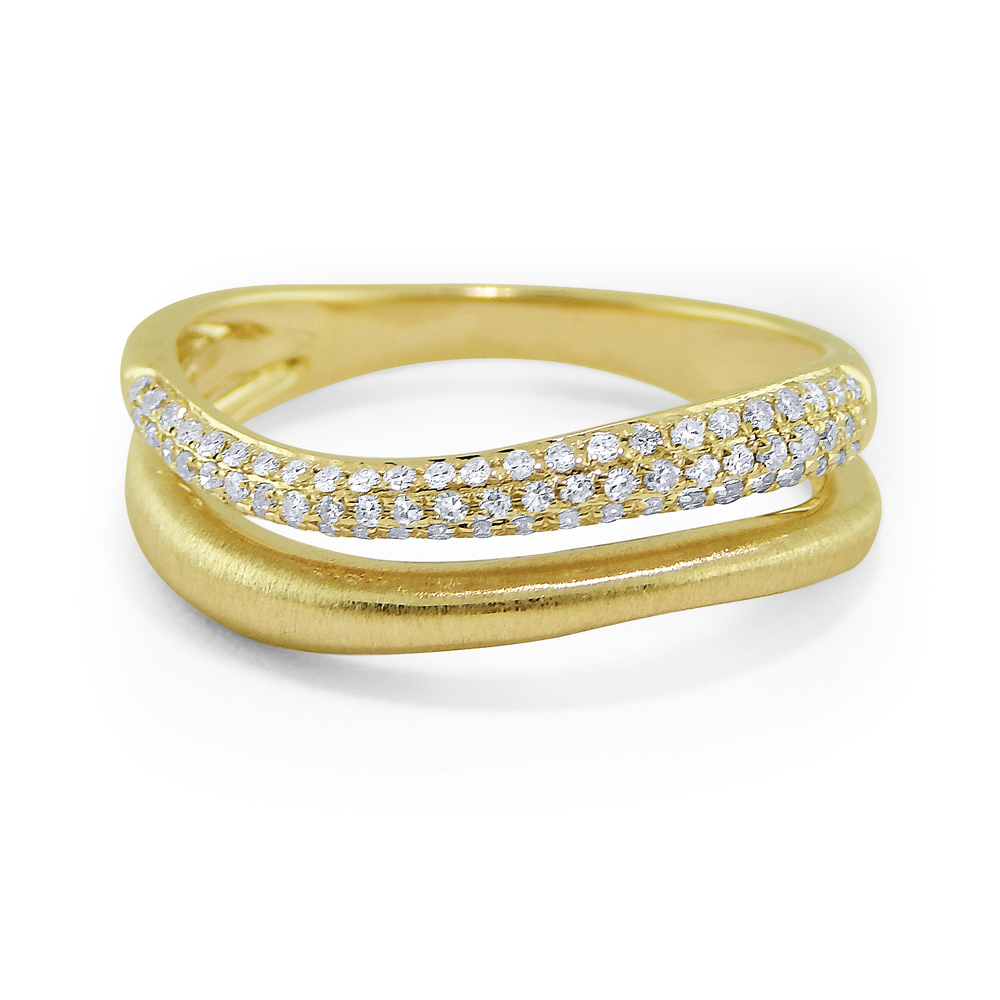 Diamonds are beautifully set in a 14K gold band accented by a band with a soft, brushed finish below.