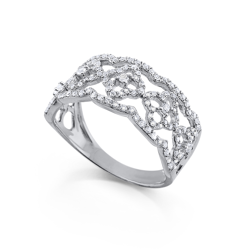 This diamond band inspired by antique lace patterns is beautifully crafted in 14K gold. Classic and timeless.