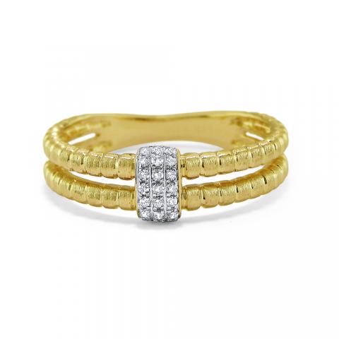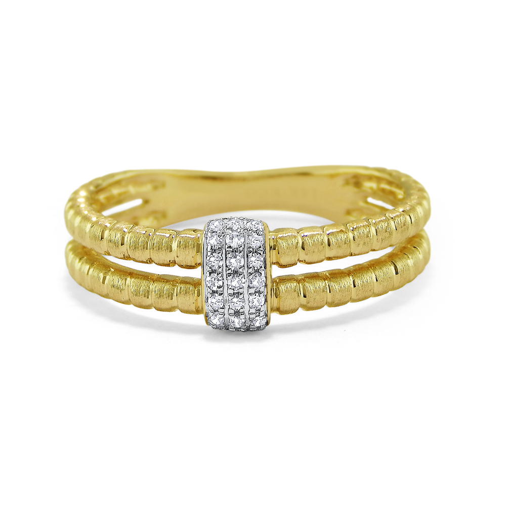 Double textured gold bands with a matte finish are graced with three rows of pave diamonds at the center.