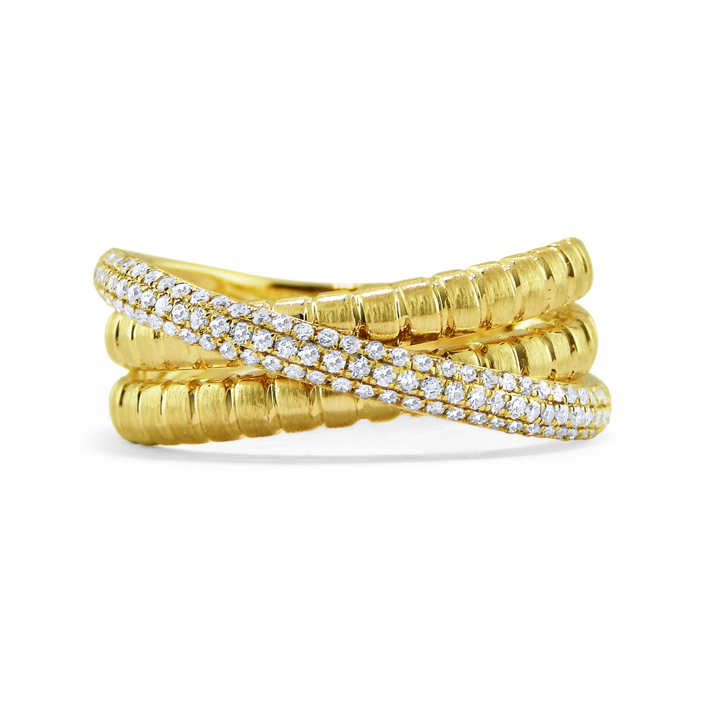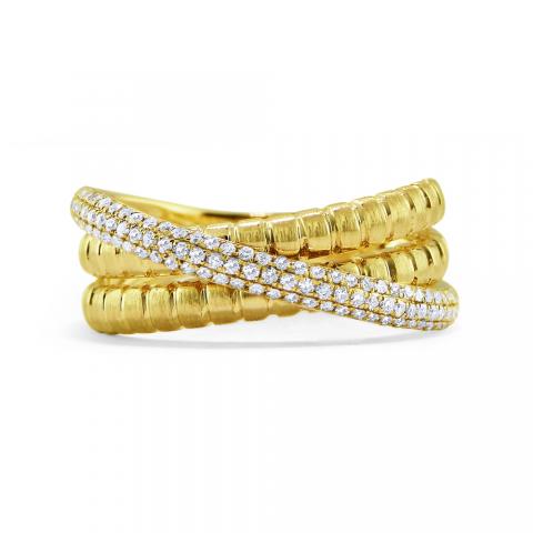 Three rows of diamonds cut across two textured gold bands for a fresh new modern look.