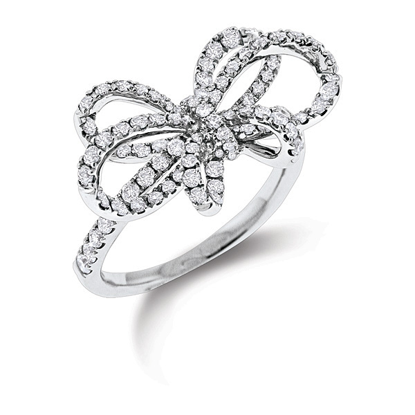 Sweet and feminine, this diamond bow ring features 93 shimmering .87 ct tw diamonds around its dainty bow shape. It is pictured here in stunning 14 k white gold and will make a charming and elegant addition to your look. Look closely and marvel at the delicate craftsmanship and finely intricate detail of this beautiful ring.
