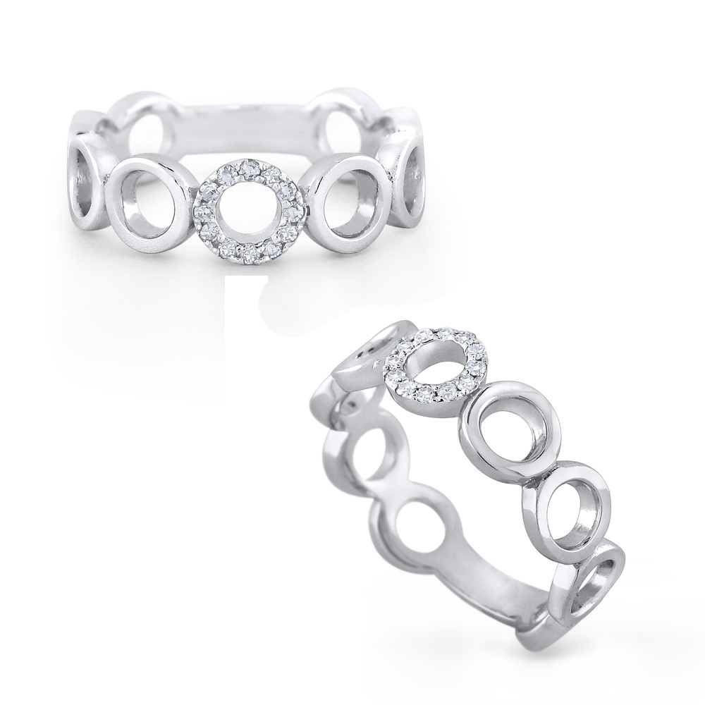 Individual open circles frame the diamond center of this ring giving it a modern geometric feel. Stack white, yellow and rose bands together or pair with your other favorite stackable rings.