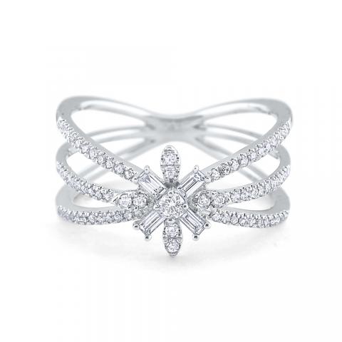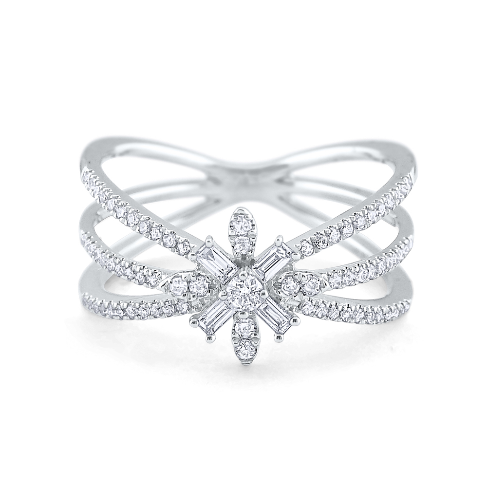 Round and baguette diamonds form a sparking starburst design held by a triple row band. Complete the look with some KC stacking rings also from the Mosaic Collection.