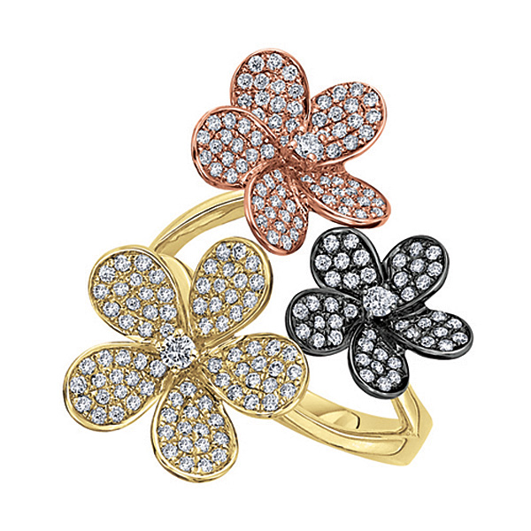 Dazzle everyone with not one, not two but three sparkling diamond flowers! This sweet and girly diamond triple flower ring blossoms with the twinkling light of 203 shimmering 1.01 ct tw diamonds and it is pictured here in 14 K yellow and rose gold with black rhodium. Let your style bloom with this glamorous look.