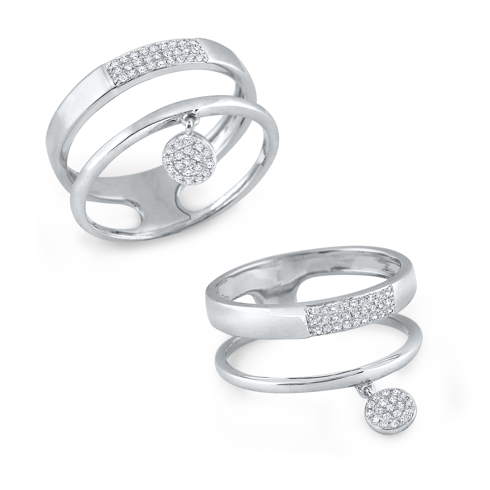 A tiny disc charm playfully dangles from this double band gold and diamond fashion ring.
