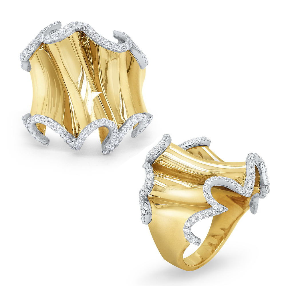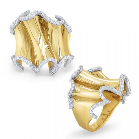 Bright yellow gold is formed to invoke soft folds of fabric accented by a border of diamonds in this bold statement ring.